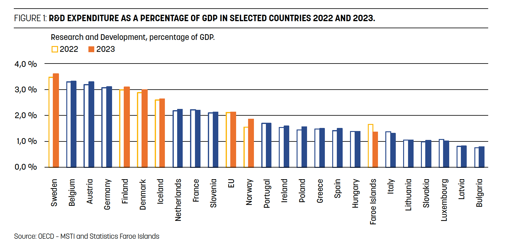 The Faroe Islands’ GDP had the highest growth at 6.7 percent, yet saw the largest drop in R&D investments.This change is mainly caused by the business enterprise sector, with its decline of more than 20 percent. As with Iceland, fluctuations in R&D investments in the Faroe Islands are expected due to its size of the population and the R&D community.