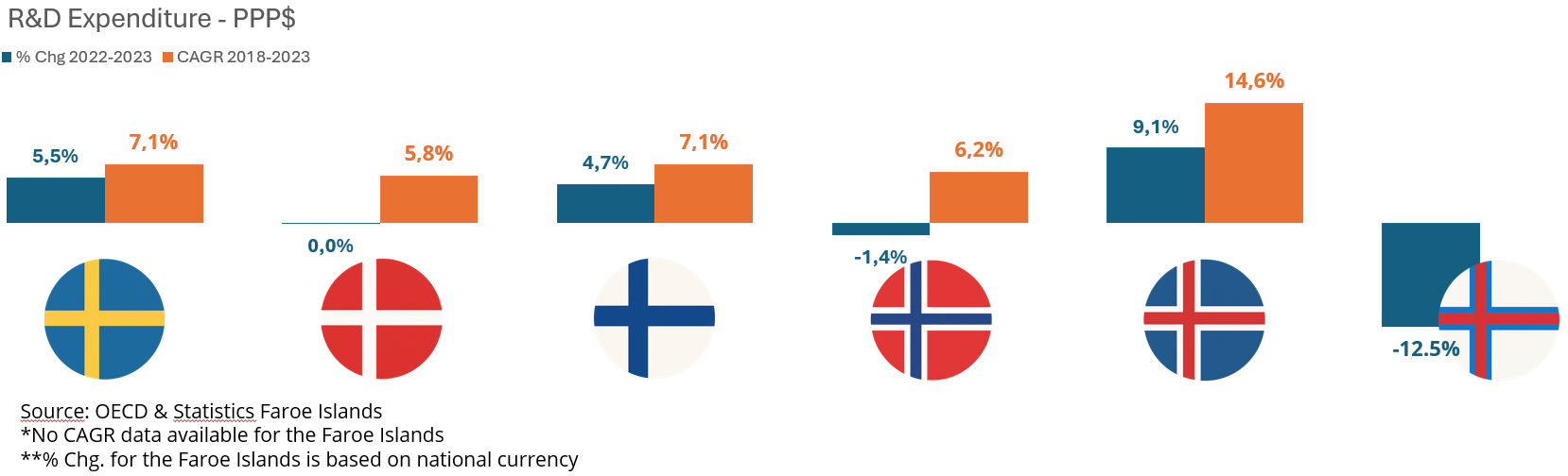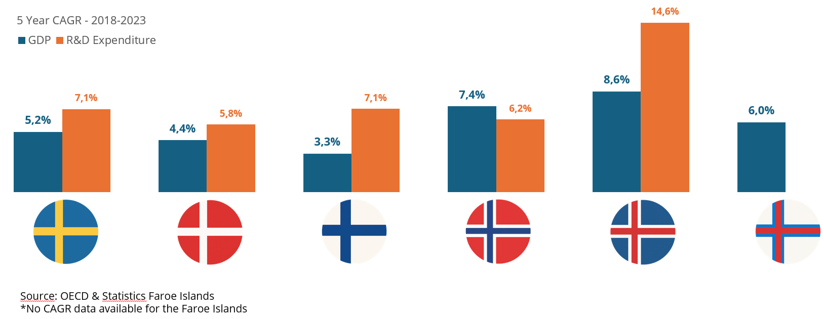 Looking at the investments in R&D in the 5 year span from 2018 to 2023, all Nordic countries recorded a compound annual growth rate (CAGR) of more than +5 percent, with investments in Sweden, Denmark, Finland and Iceland outpacing GDP growth.