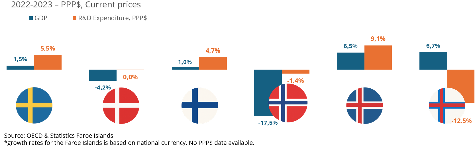 Figure 2 Growth rates in GDP & R&D among Nordic countries. PPP$ current prices. 2022–2023.