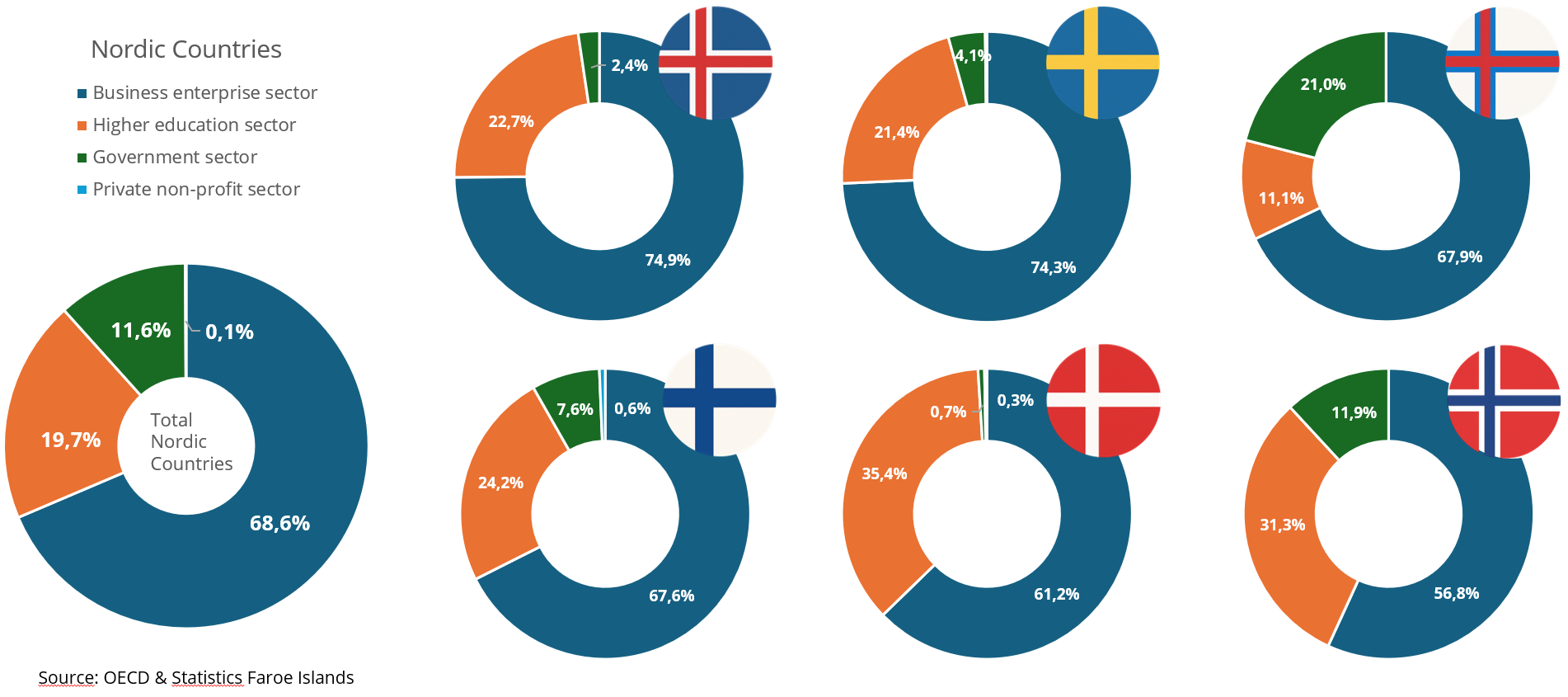 The business enterprise sector is the primary R&D performer in the Nordic countries, representing 69.6 percent of the total investments in R&D in 2023. Higher education accounts for 19.7 percent and the government sector for 11.6 percent. Private non-profit organisations account for 0.1 percent.