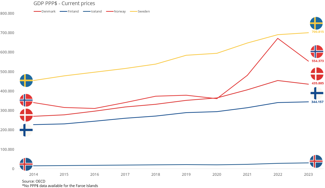 Figure 3 Trendlines – GDP in Nordic countries. PPP$ current prices. 2014–2023.